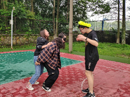 素拓比赛共分为“摆大字”“纸杯传水”“名著我知道”“投壶”“蒙眼运花环”“迅速旋转”六个游戏环节。最激发同学们浓厚兴趣的是“名著我知道”环节,小组成员从马鞍山凉亭出发,寻找路人回答关于名著的两个问题并录制视频,答对后返回任务点,工作人员记录从出发到返回任务点的总时间。“你最喜欢的书籍是哪本?”“喜欢这本书的理由是什么?”“这本书中,你记忆最深刻的是哪句经典名言?”同学们提问新颖,引人深思。“蒙眼运花环”环节,四人完成蒙眼背人任务,绕过重重障碍,将花环戴在终点处队员头顶。游戏考验参赛者间的默契,过程妙趣横生,场上气氛十分融洽