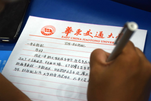 活动尾声,新生们在信纸上向一年后的自己写下目标与期望。来年此时,工作人员将会把信封发回新生手中,让新生在踏入大学校门一年后依然初心不忘。