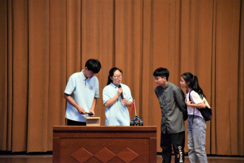 暑期三下乡社会实践代表团的成员,这是我们科技展的作品。”摊位上的遥控小车吸引村民驻足围观,村头的爷孙俩聆听着队员们的讲解,并不时点头。小车配备红外探测技术,能够处理分析周围路障情况并迅速进行躲避。在队员的指导下,爷孙俩也亲手体验了现场的科技产品。