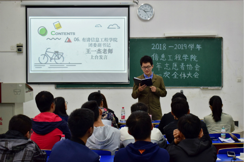 10月14日,信息学院于逸夫楼114室召开2018-2019学年青年志愿者协会第一次全体大会。信息学院学工办副主任兼团委副书记王一杰,青年志愿者协会会长卢月绒出席会议。青协全体成员与会。