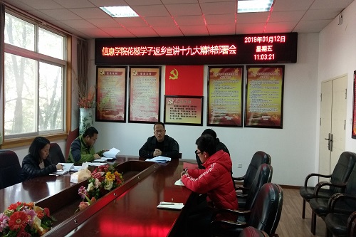 1月12日,信息学院于教四栋304室召开“花椒学子返乡宣讲十九大精神”部署会,党委副书记何仲坚、党委组织员黄清华、学工办主任兼团委书记陈文锦、学工办副主任兼团委副书记杨青、学生党员管理中心常务副主任于鹏参加会议,共同商讨活动开展相关细节。