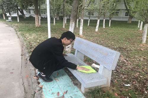 校园内的石凳是为学生提供休息场所的公共设施,而近日来连绵的淅淅小雨却给它们蒙上了一层泥土。“我们希望自己可以做一些力所能及的事情,清理校园石凳,为大家提供一个干净清洁的休息场所。”17计算机2班团支书赵敏说道。