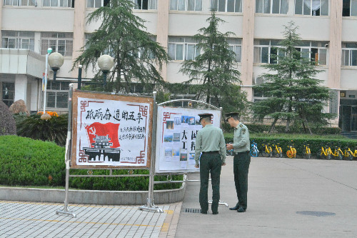 此外,升旗处放置“砥砺奋进的五年”“大国工程”成果展览板,记录着中国五年来取得的巨大成就,供同学们学习交流。