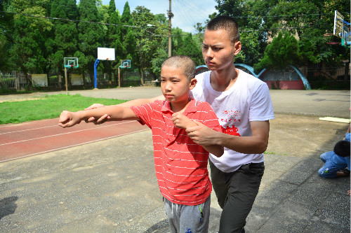 “军体拳,既能展现孩子们的风采,更能教会他们在遇到危险时如何保护自己。”服务团中的国防生潘勇强说道。国防生志愿者王榕平和潘勇强充分利用自身在校训练所学的知识,手把手地教孩子们打军体拳。经过一番学习,孩子们打得有模有样,颇有一番“小军人”的风姿。