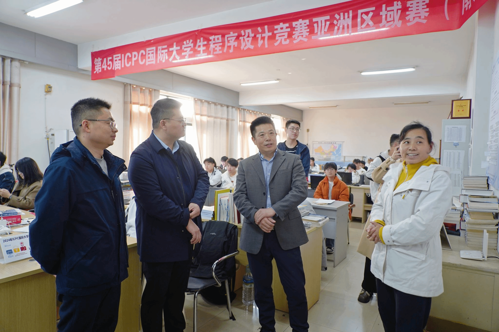 班会结束后,徐长节前往ACM竞赛训练基地,看望了正在训练的竞赛学员们。他向竞赛指导老师周娟表示敬意,并详细了解了训练条件、培训方式及竞赛情况等。他寄语同学们,要将所学专业知识与社会需求相融合,将个人成长与国家发展相结合,勤学苦练、埋头苦干,努力在大有可为的新时代大有作为,成为立大志、明大德、成大才、担大任的时代新人。