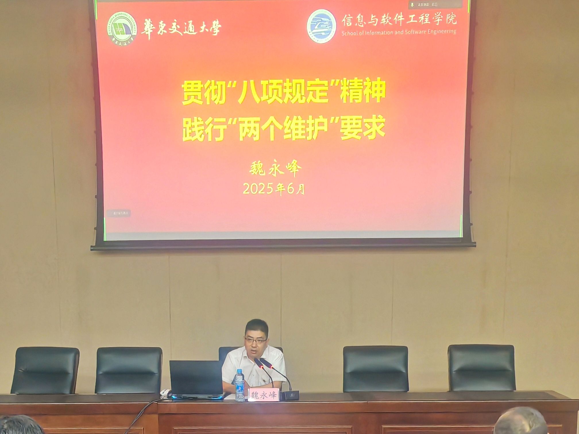 为强化毕业生党员的政治意识和责任意识,鼓励毕业生党员在新征程继续弘扬华交“火车头”精神,展示信工“‘芯’铁军”形象,6月11日,信息与软件工程学院于南区教5栋108报告厅开展信息与软件工程学院毕业生党员离校教育。学院党委书记魏永峰,党委副书记冯荣刚,党委组织员黄芳,党委兼职组织员刘通出席会议。会议由学院党委委员、党委组织员王业贵主持,2025届全体毕业生党员参加。