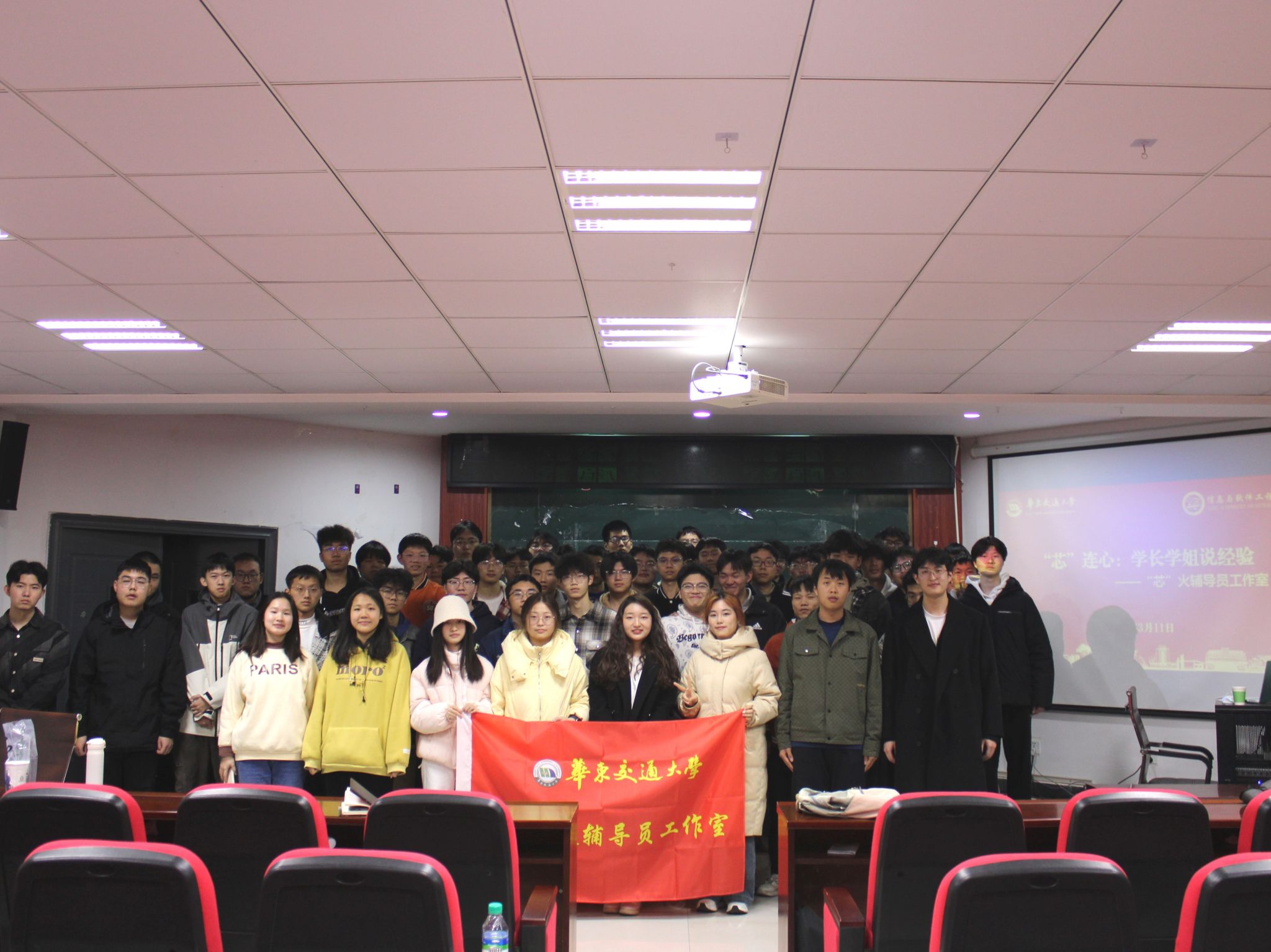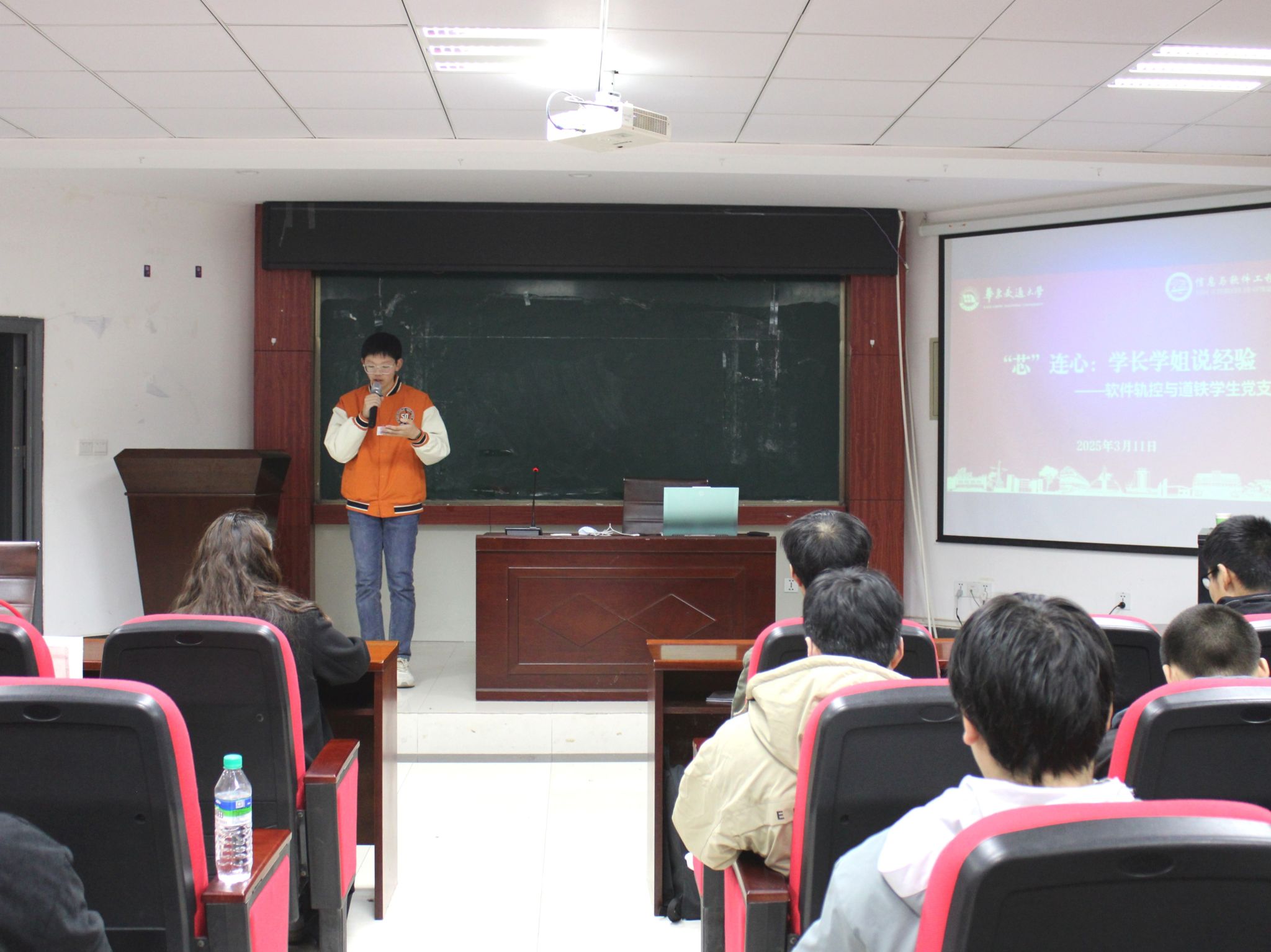 2025年3月11日,为促进学长学姐与学弟学妹之间的互动交流,搭建学习成长的桥梁,信息与软件工程学院“芯”火辅导员工作室与软件轨控与道铁学生党支部在北区35栋一楼报告厅联合举办了“‘芯’连心:学长学姐说经验”主题活动。本次活动由24级人工智能2班副班长张沐曲主持,24级人工智能全体学生参与。