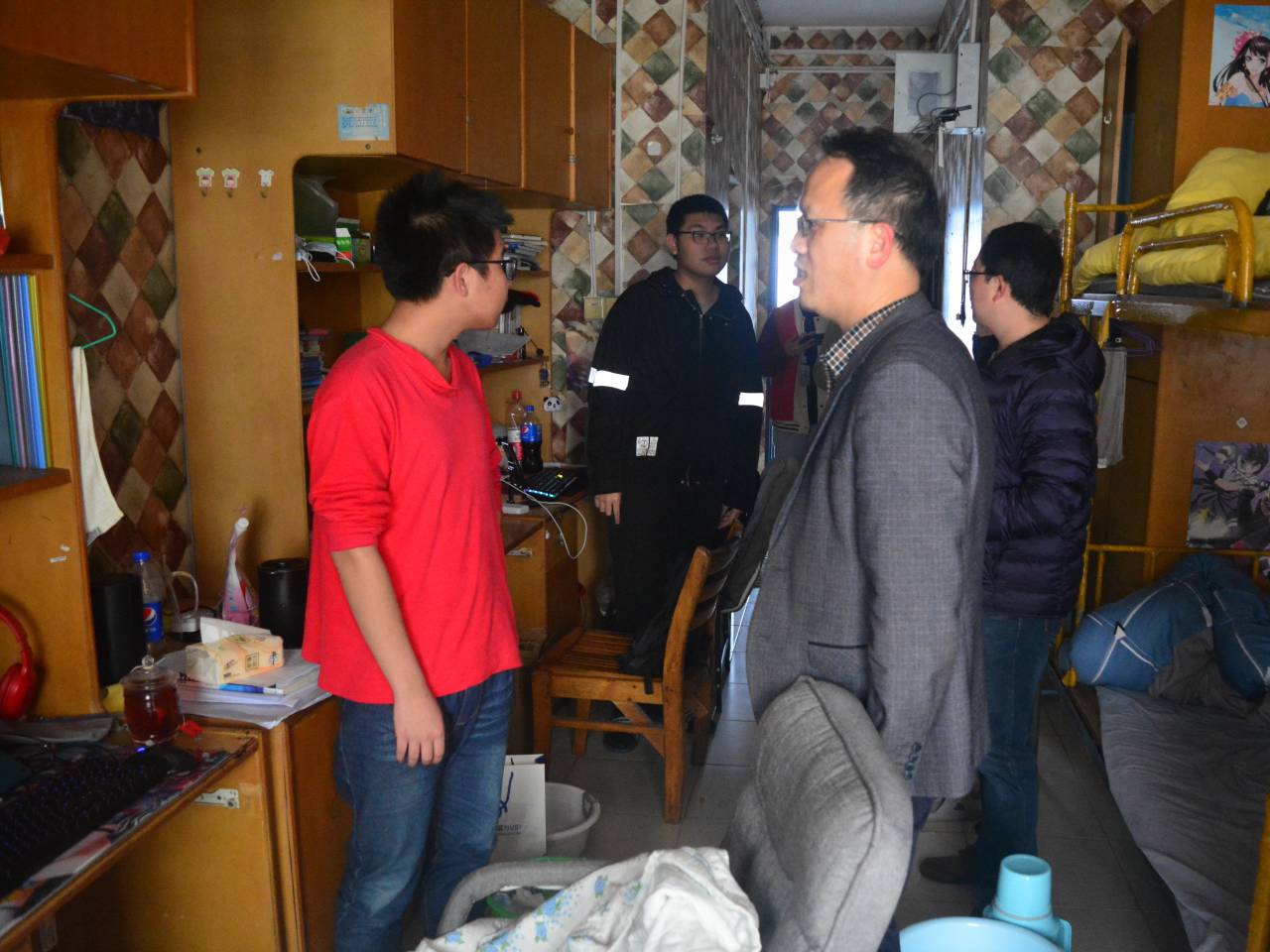 “将来打算怎么办?考研还是投简历找工作?”“复试情况怎么样?可以通过了么?”对于即将毕业的大四的学生,艾国金关心更多的是他们的未来,对于寻找工作存在困难的同学会提出指导和建议。杨青对于女生寝室的卫生给予了肯定,对卫生状况较好的宿舍提出表扬,询问了部分同学的生活近况。