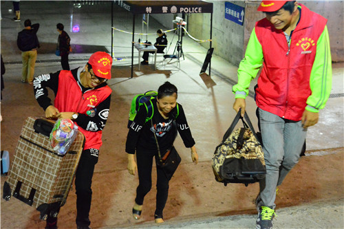 信息志愿者帮助旅客提行李