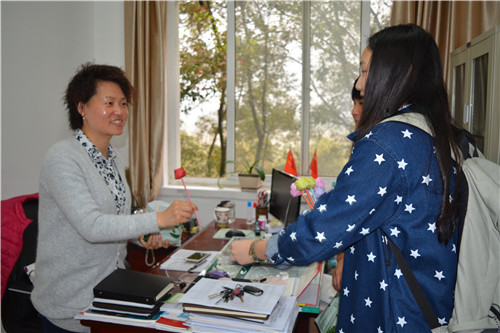 “老师,能伸出您的双手么?”挤出护手霜,轻轻地擦在手心手背,温柔地带上指套,还在低头整理教科书的万涛老师,对于孩子们的举动有些惊讶。“老师,平常看您经常使用粉笔,手指都已经干裂,皮肤也变得粗糙了,我们真的很为您心疼,所以我们就准备了这个护手霜和指套,希望你能喜欢。” 信息学院学生郭婷苑说道。除此以外,学生们还为老师送上了自己制作的DIY礼包,别样的礼物和贴心的话语让女老师们很是感动。