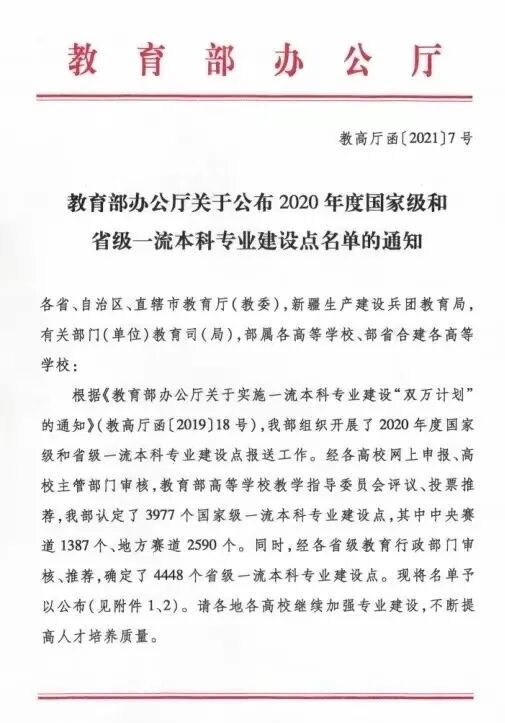 教育部办公厅关于公布2020年国家级和省级一流本科专业建设点名单的通知
