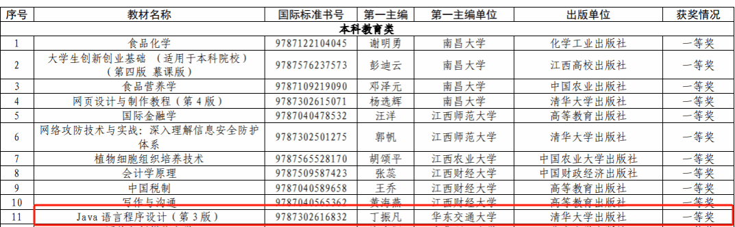 近日,江西省教育厅发布《关于公布第六届江西省普通高等学校优秀教材获奖名单的通知》(赣教高字〔2023〕53 号),公布了第六届江西省普通高等学校优秀教材获奖名单。我院丁振凡教授教材《Java 语言程序设计(第 3 版)》荣获本科教育类优秀教材一等奖,特此喜报!