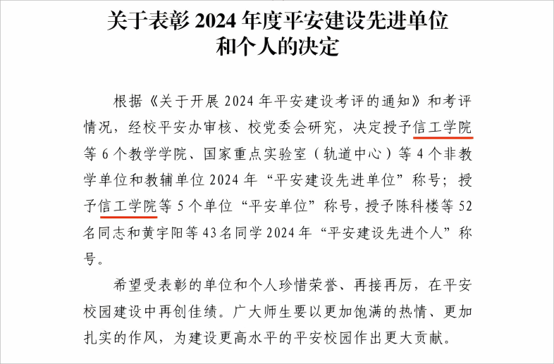 4月28日下午,学校召开2024年平安建设总结表彰会暨2025年平安建设、校园安全稳定工作会,对2024年平安建设工作进行总结表彰。信息与软件工程学院获评2024年“平安建设先进单位”和“平安单位”称号,位列全校第一。学院连续14年获此殊荣。