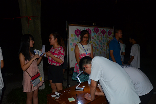 7日晚上六点,养心湖畔十分热闹,“小伙子,长得楞, 生下来,就会蹦, 不象样, 不姓他爹的姓,猜一动物,这个是不是骡子啊?”“恭喜你,猜对了,拿着这张纸条去下一个灯谜区吧。”灯谜会上每个灯谜区前都围满了猜灯谜的人,大家高兴地解答着谜题。据悉,猜谜者答对一定数量的谜题就能到设立在九曲亭上的兑奖处领取荷花灯。“我们得在每个灯谜区都答对一两个谜题才有资格去领奖品,虽然这些题目都比较简单,但是想每个区都拿下还是有点困难。而且这还设了个英语灯谜区,有些谜题不认识单词就拿不下了,看来我们有回去补英语的必要了”信息学院14级新生许佩文笑着调侃道。
