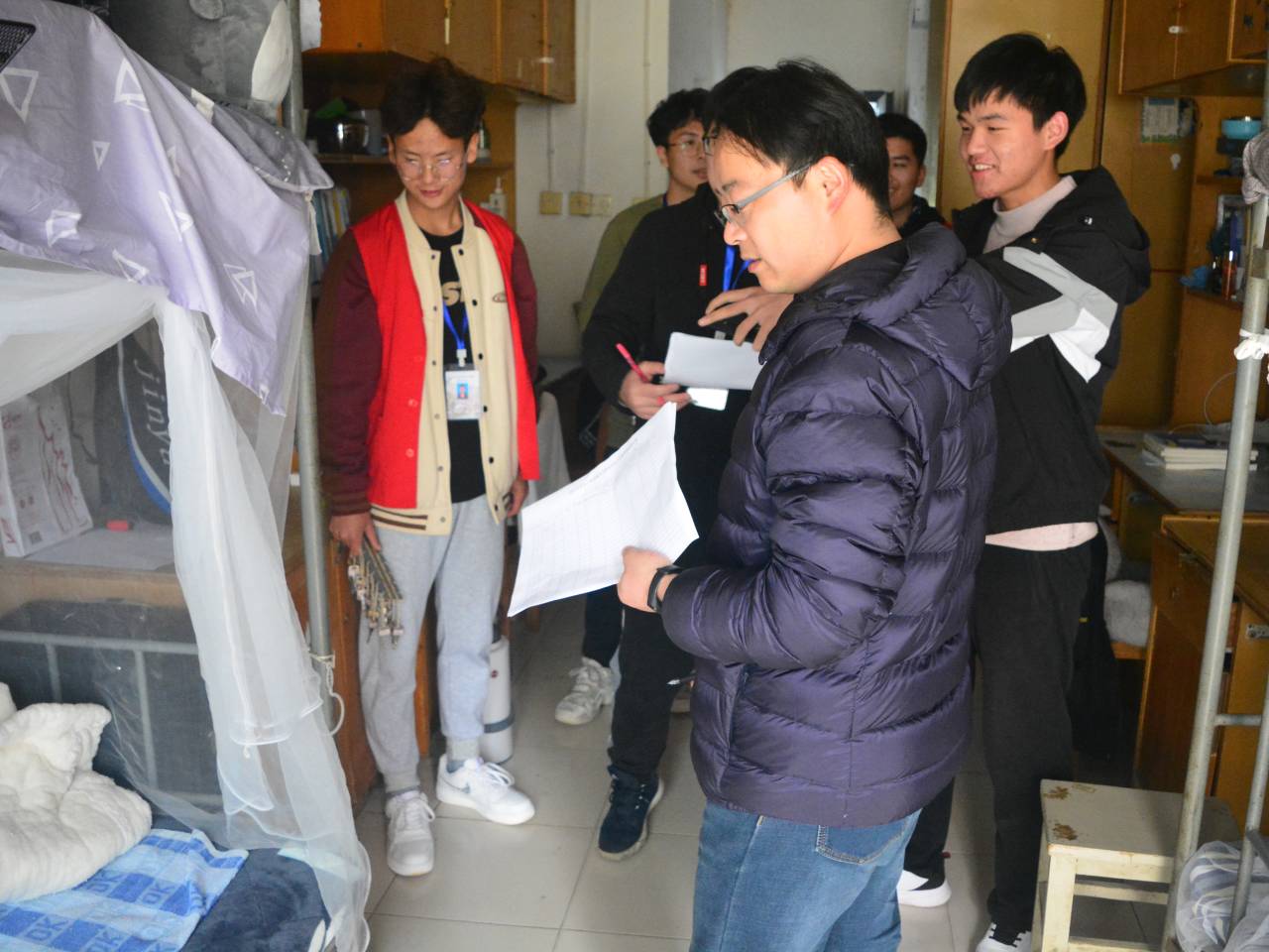 各个楼层,每间寝室均一一进行检查,“被褥出门或学习时要记得叠放整齐”,“这个房间存在的味道比较大,多开窗透气”,“物品摆放太乱,不用的及时丢掉……”面对存在卫生和物品摆放问题的宿舍,何仲坚悉心劝说并亲自帮助部分宿舍收拾桌面,言传身教。