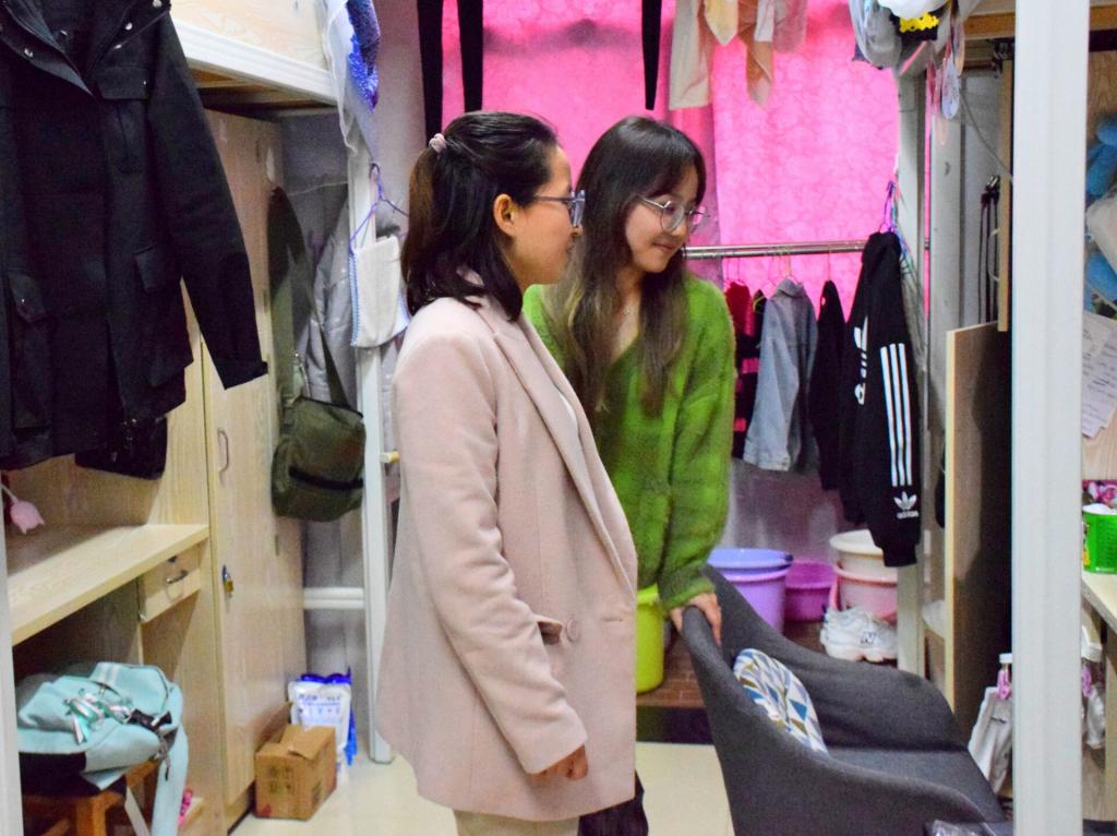 “将来打算怎么办?考研还是投简历找工作?”“复试情况怎么样?可以通过了么?”对于即将毕业的大四的学生,艾国金关心更多的是他们的未来,对于寻找工作存在困难的同学会提出指导和建议。杨青对于女生寝室的卫生给予了肯定,对卫生状况较好的宿舍提出表扬,询问了部分同学的生活近况。