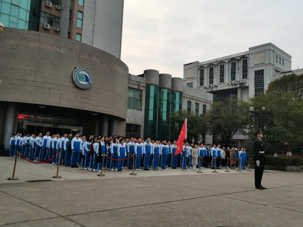 出旗令响,国旗班护旗手昂首挺胸、步伐矫健,将国旗护送到升旗台前。伴随国歌响起,五星红旗缓缓升起,全体师生行注目礼,气氛庄严肃穆。