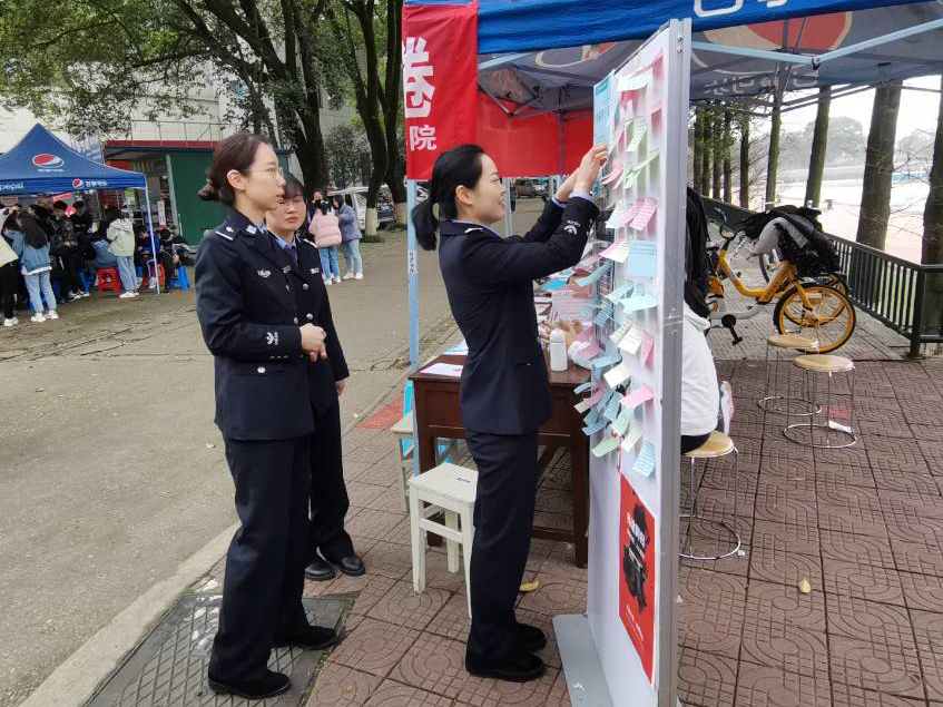 活动主要分为游戏和采访两个部分。游戏环节中,参与者通过“一分钟抄写”,将抽签条上的法律法规、相关案例正确抄写且达40字,即可将便签贴在宣传板上合影留念并获得参与奖品一份。活动使参与者在体验游戏乐趣的同时收获相关知识,倍受广大师生好评,不少受访者纷纷表示收获颇多,希望能为校园平安建设添砖加瓦。期间,省委省政府戒毒中心的公安人员也打卡参与“一分钟抄写”,并对我院的宣传活动给予肯定。