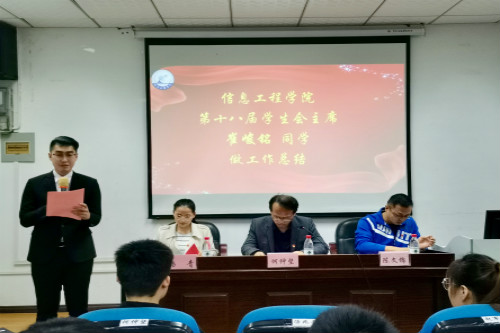 何仲坚对大会内容作出总结,他说道:“上一学年中,学生会及团学组织紧紧围绕校、院党委中心工作,紧扣‘立德树人’根本任务,服务广大同学成长成才,以创新思维、扎实干劲组织开展了一系列健康有益的课外活动。”他列举了一系列学院活动,从心理剧大赛到“青春飞扬,卓越启航”表彰晚会;从丰富多彩的志愿活动到暑期三下乡社会实践活动;从寝室文明建设到五四运动一百周年“我为团支部代言”系列活动;从“三风”主题教育活动到科技创新系列活动……信息女篮、信息男足获得校“交大杯”第二名、暑期社会实践先进集体、“互联网+创新创业大赛”优秀组织奖校宣传工作先进集体等是上年中学院获得的部分荣誉。