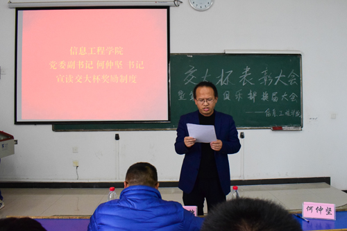 为推进校园体育文化建设,为俱乐部汇入新活力。11月15日,信息学院于逸夫楼109室召开第十八届俱乐部换届暨“交大杯”表彰大会,党委副书记何仲坚、学工办主任兼团委书记陈文锦出席会议。信息学院第十七届、十八届俱乐部成员与会。