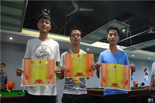 进入决赛后,现场气氛愈演愈烈,选手们也是表现的更加出色,华丽的球姿,专注的表情,恰好的力道,精确的走位,严密的防守,都无一不体现着选手们专业的水平。经过激烈比拼后,15级通信一班拔得头筹,获得冠军,台球俱乐部和15级信息一班分获亚军和季军,樊羽森为获奖团体颁发奖状。