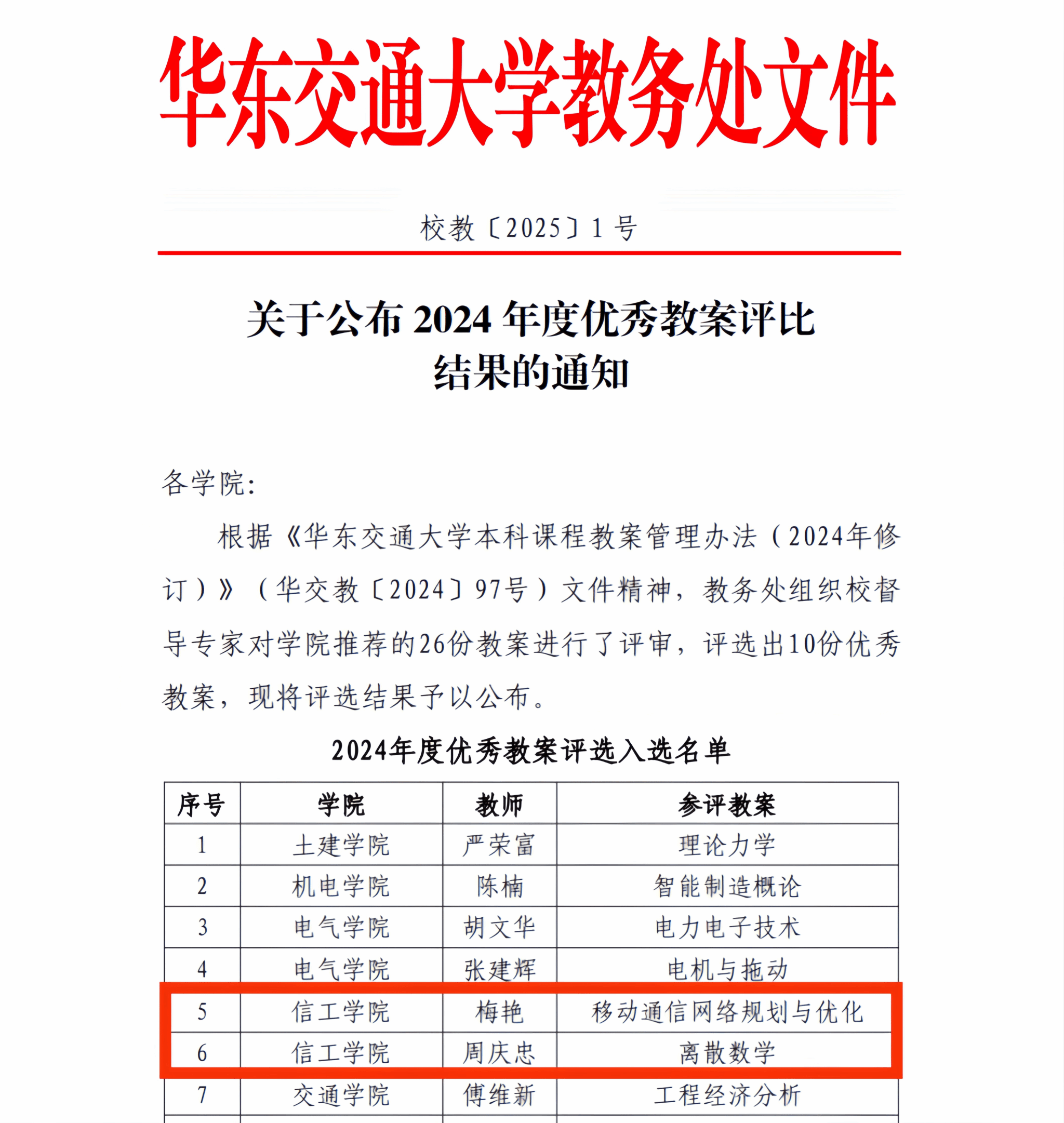 近日,华东交通大学教务处组织开展的2024年度优秀教案评选结果揭晓,我院梅艳老师《移动通信网络规划与优化》课程教案与周庆忠老师《离散数学》课程教案双双入选优秀教案榜单。
