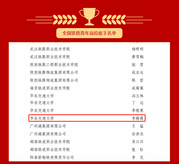 信息工程学院李萌萌老师荣获“全国铁路青年岗位能手”称号。